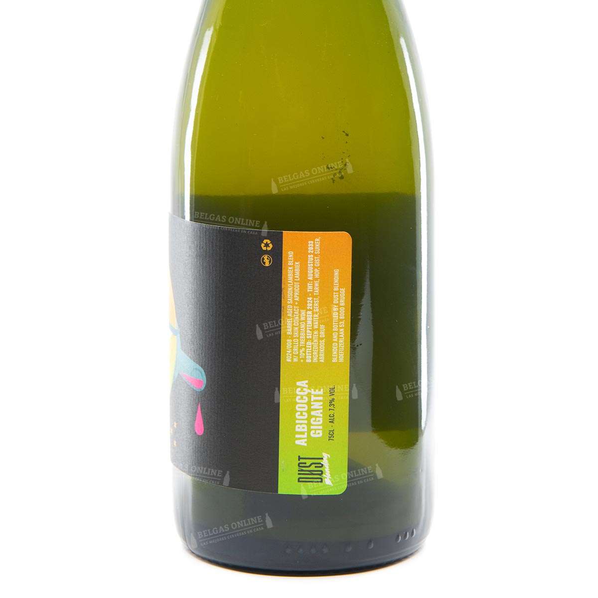 DUST Blending es un proyecto artesanal de coupage nacido en Brujas de la mano de dos amigos, Dirk y Stéphane. Su filosofía consiste en mezclar saison envejecida en barrica con lambic belga y, frecuentemente, con elementos del mundo del vino natural y la fruta. La Albicocca Giganté lleva esa filosofía a su máxima expresión, combinando cuatro componentes en un solo blend: saison en barrica, lambic de albaricoque, uva Grillo siciliana en skin contact y un 10% de vino Trebbiano italiano.