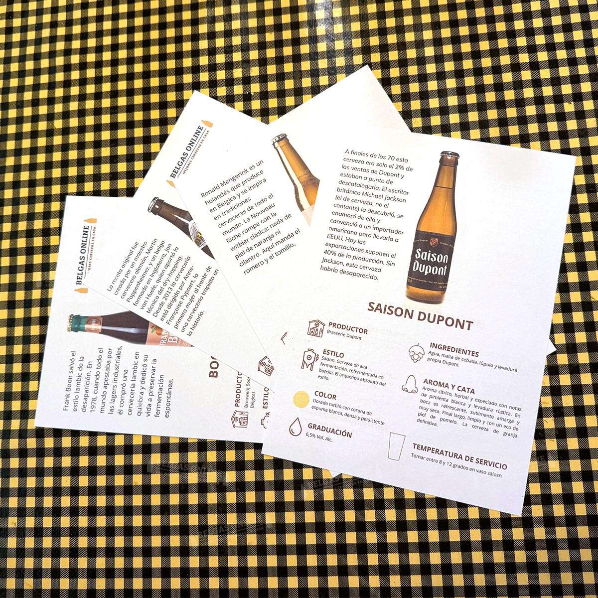 Cata de primavera con cuatro cervezas belgas refrescantes: Saison Dupont, Orval 2025, Nouveau Riche (trigo con romero) y Boon Framboise. Incluye abridor, fichas de cata, hojas de cata en blanco para sus apuntes y bolígrafo. Edición estacional limitada.