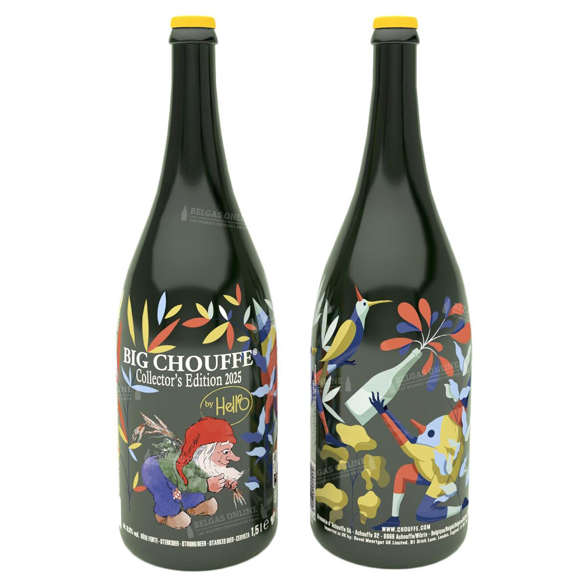 Por primera vez, Chouffe ha colaborado con un colectivo de artistas. Desde 2005, el reverso de las botellas de Big Chouffe presenta una obra diferente cada año, convirtiéndose en un evento anual esperado tanto por los fans de Chouffe como por los artistas invitados. Este año, combinamos autenticidad e innovación con el Hell’O Collective, un dúo artístico formado por Antoine Detaille y Jérôme Meynen. Durante más de diez años, este colectivo ha construido un universo compartido de poesía, fantasía e imaginación, desde murales de gran tamaño en espacios públicos hasta obras más íntimas para exposiciones y colaboraciones gráficas.