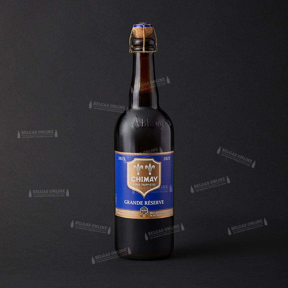 Es la misma Chimay Bleue que en formato 33cl, pero en botella de 75cl tipo Burdeos con cierre de corcho y jaula metálica. El nombre «Grande Réserve» se reserva exclusivamente para este formato, y es el que la cervecería posiciona como pieza de guarda y regalo de prestigio. Cada etiqueta lleva el año de embotellado impreso, lo que permite al coleccionista seguir la evolución de la cerveza a lo largo de los años.