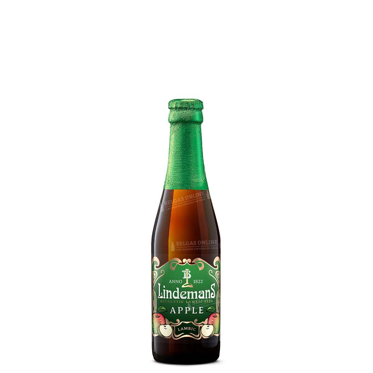 Fruit Lambic de manzana de Lindemans, 3,5% vol. Zumo de varias variedades de manzana sobre lambic de fermentación espontánea. Dulce, fresca y accesible: la puerta de entrada al mundo lámbico. 25 cl.