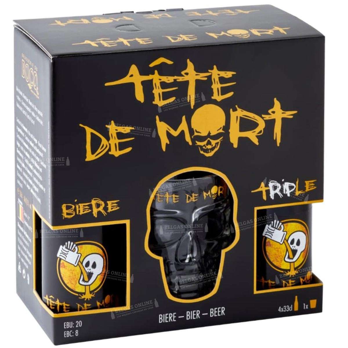 Incluye 4 botellas de 33 cl de Tête de Mort Triple + 1 vaso serigrafiado oficial, presentado en estuche regalo.