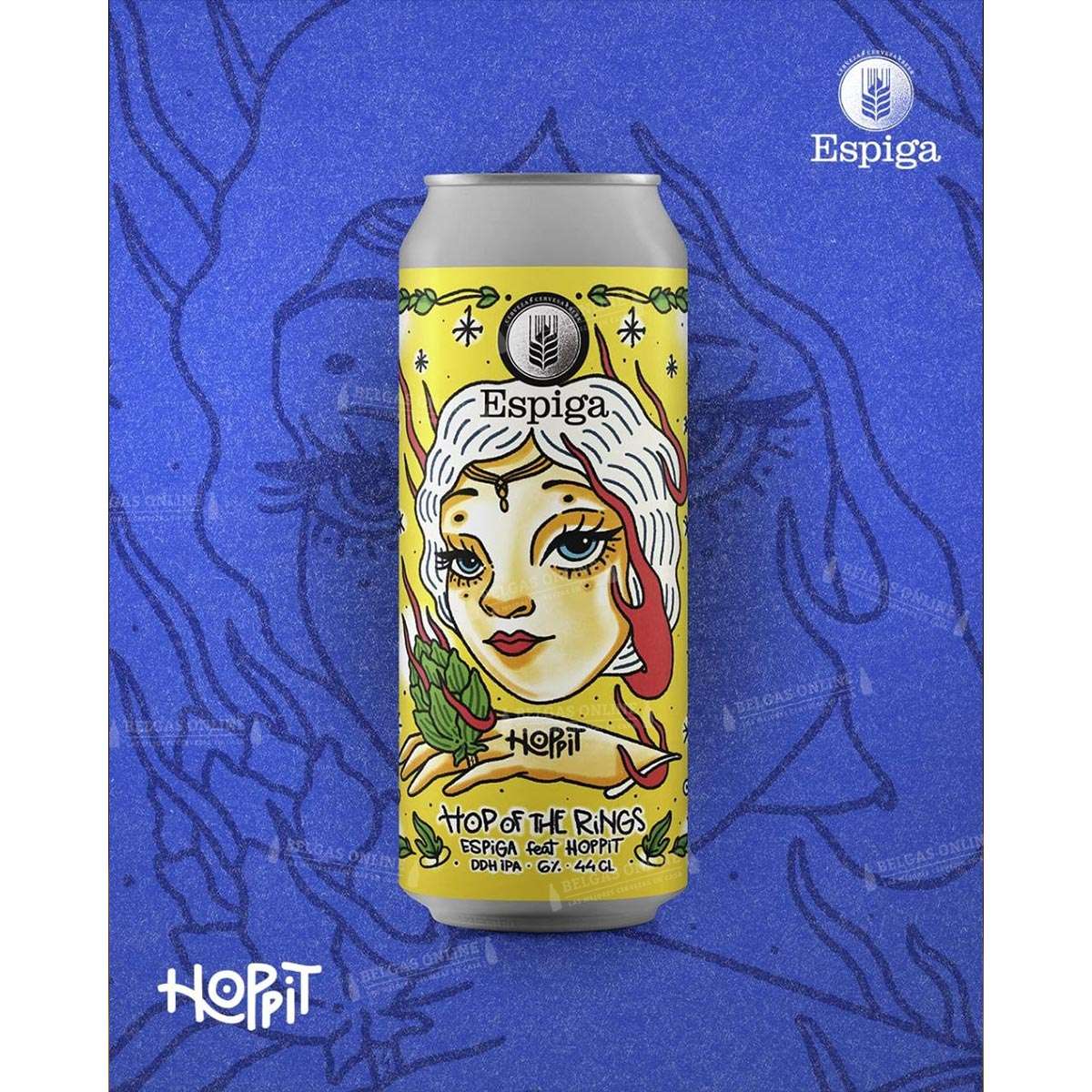 Hop of the Rings de Cerveses Hoppit es una Hazy IPA con doble dry hop (DDH) de 6,0% vol., colaboración con Cervesa Espiga. Su rasgo técnico distintivo es el trío lupulado Idaho 7, Simcoe y Strata, ejecutado en doble dry-hop sobre una base maltosa con trigo y avena que aporta la textura sedosa característica del estilo.