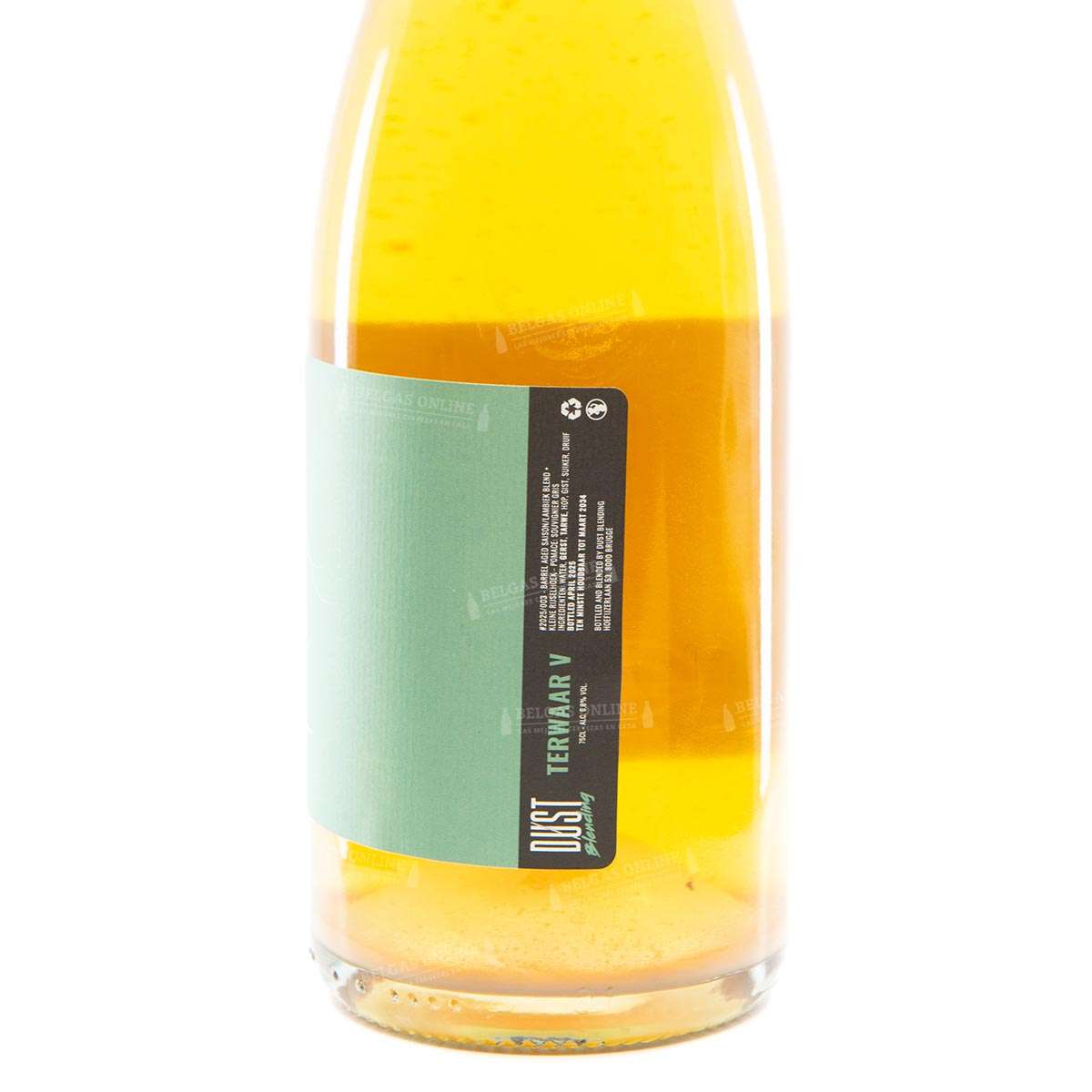 Terwaar V (75 cl) de DUST Blending es un blend de saison envejecida en barrica y lambic belga con pomace de Souvignier Gris del Klein Rijselhoek, con una graduación del 6,8% vol. Referencia #2025-003, embotellada en marzo de 2025: la quinta entrega de la serie que lleva el terroir belga por nombre y por bandera.
